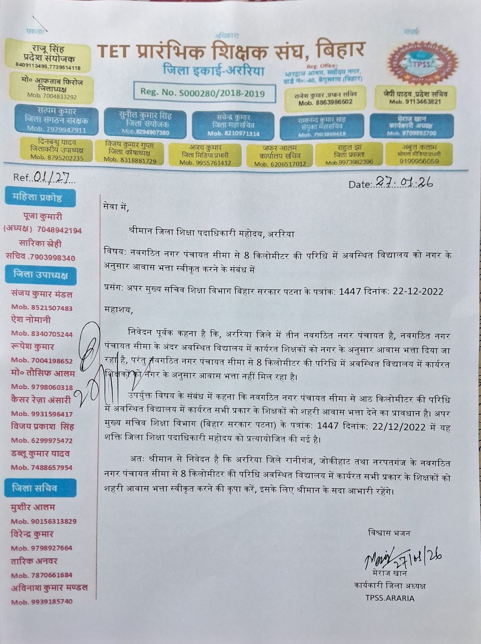 बिहार शिक्षक खबर: शहरी क्षेत्रों के आवास भत्ता बढ़ाने की मांग तेज़! शिक्षकों ने DEO को सौंपा ज्ञापन!